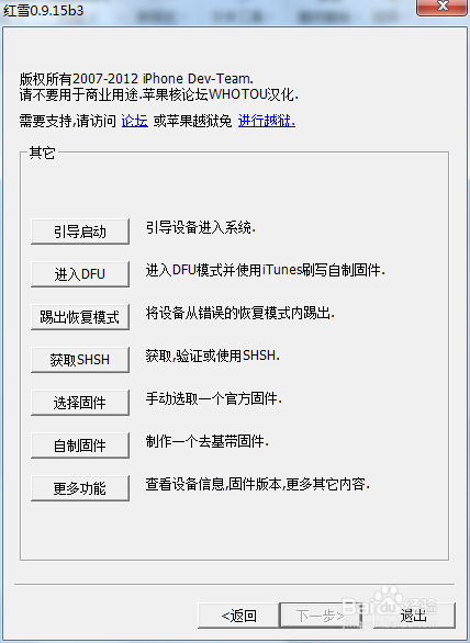 1)进入DFU模式,不懂的话,就下载红雪工具:手机数据线连接上电脑,解压后,打开红雪,选择其它,选择进入DFU,下一步,按照提示操作就可进入DFU模式。