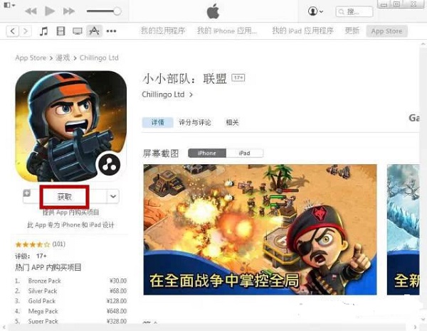 第一步,打开iTunes程序,浏览需要下载应用,然后点击“获取”,即可下载该应用。