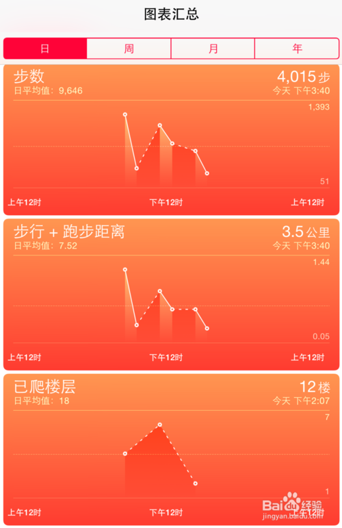 6、如下图所示,在这里可以看到我当前所行走的频数,距离,以及爬了多少层楼。对于当前的 iPhone6 机型而言,可以看到自己在一天内爬的楼层。如果是 iPhone5s 的话,由于没有气压传感器,就只能看到步数与距离。