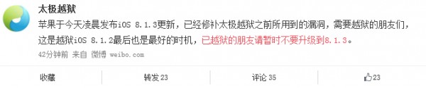 此外,太极越狱还表示,这是越狱iOS 8.1.2最后也是最好的时机,已越狱的朋友请暂时不要升级到8.1.3。
