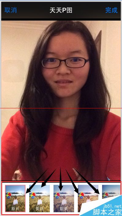 6、如图一所示,依次完成如图的两个步骤就能看到”天天P图“的图标,点击它进入可看见天天P图中的多个效果,进行个人喜好的选择即可。