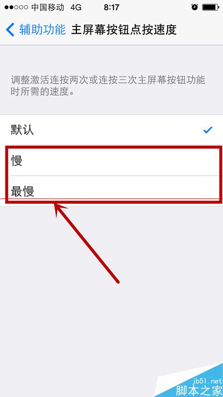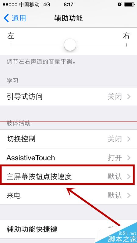 4、弹出界面,下拉菜单中找到“主屏幕按钮点按速度”,如图: