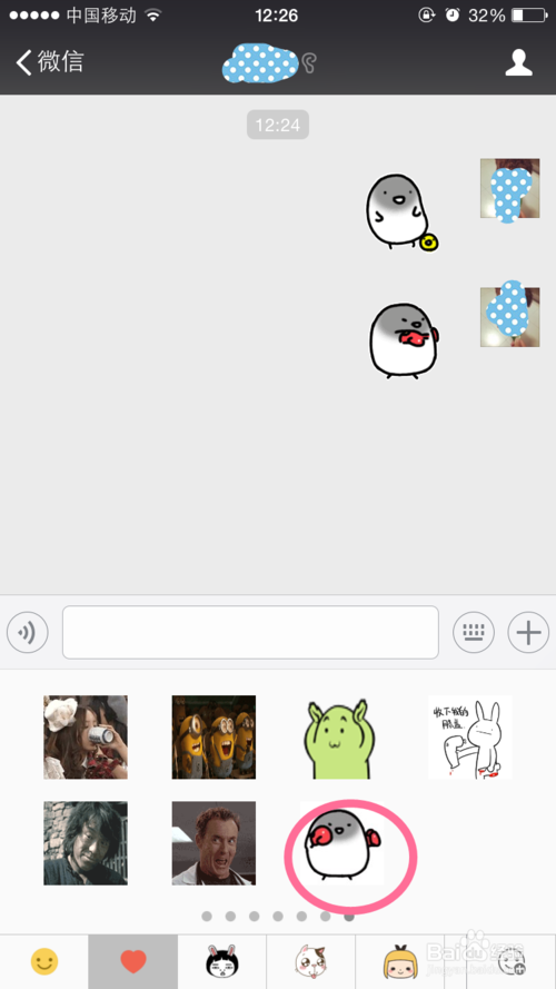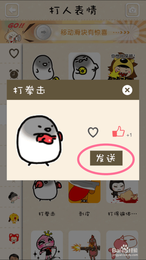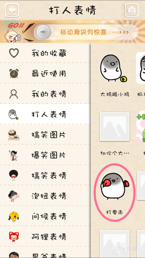 3、进入表情库界面,选择一个你喜欢的动态表情,我在这里选了“打拳击”这个表情,即粉色圆圈里的表情