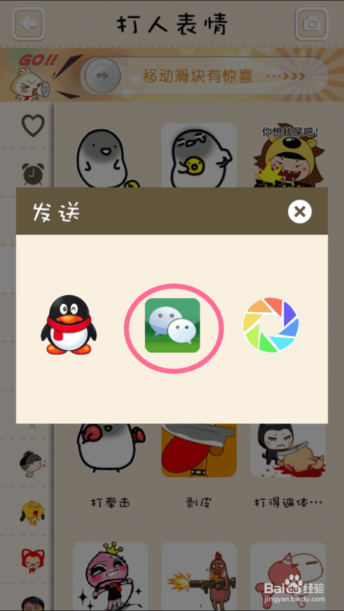 5、点击发送后,程序会弹出另一个对话框,让你选择往哪个程序中发送这个表情,当然,我们选择微信图标