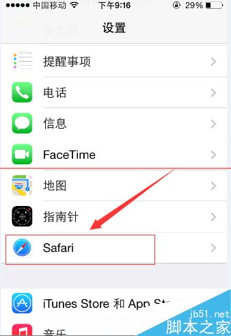2、在设置的下半部分找到Safari,点击进入Safari具体进行设置。