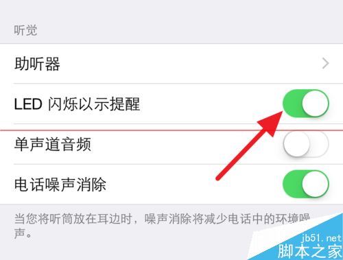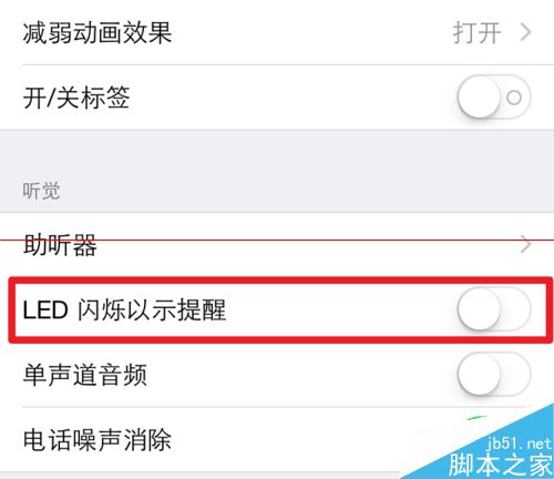 4、进入辅助功能后,拉到下面,在【听觉】下就可以看到【LED闪烁以示提醒】