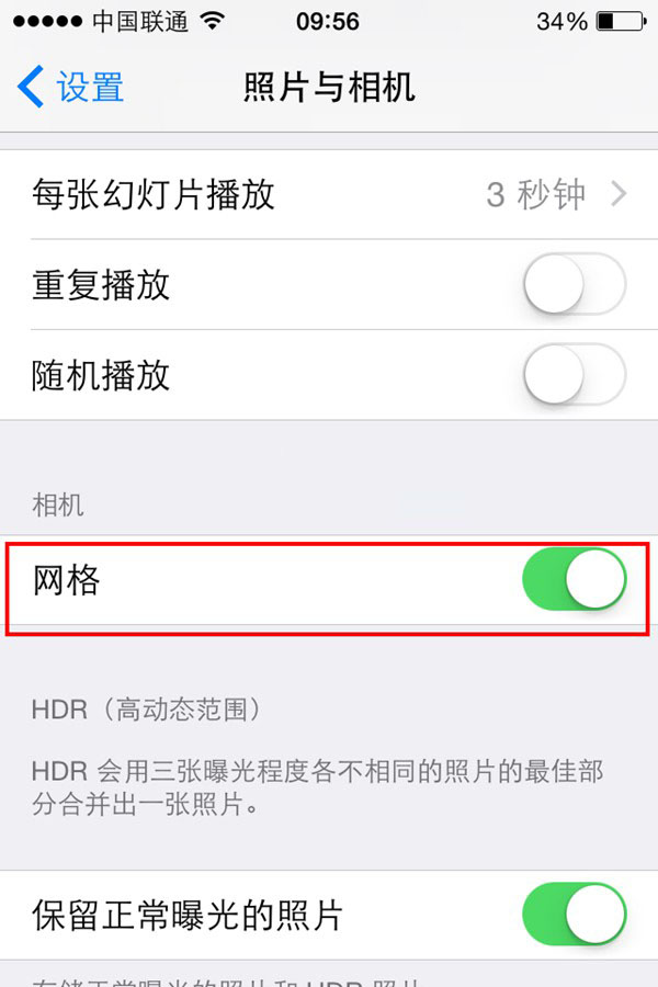 三、然后进入到照片与相机设置界面,找到“网格”一项,点击右方的滑块开启该功能。如下图所示。