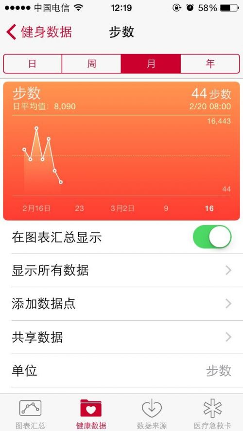 它也支持添加第三方应用程序中的健身数据,并可在图表中显示。