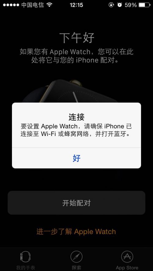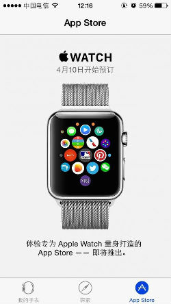 打开这个应用,我们就能看到它有“我的手表”,“探索”和“App Store”这三个栏目。由于小编与Apple Watch隔海相望,只能推测“我的手表”应该是Apple Watch的设置选项。