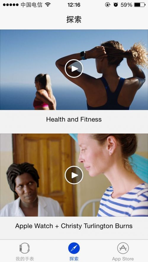 “探索”栏则是Apple Watch的一些宣传片,展示这款智能手表能给你的生活带来什么改变。