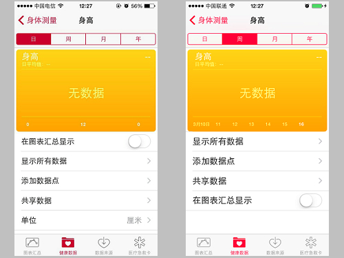 iOS8.2也对 “健康”应用进行了许多改进。首先它对身高,体温,血糖和距离这些数据增加了测量单位。
