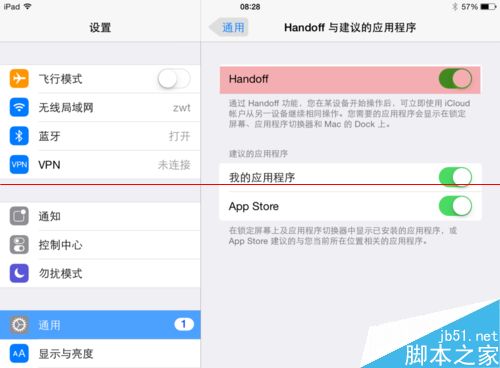 6、iPad也同样打开【设置】-【通用】-【Handoff 与建议的应用程序】,确认【Handoff】已经开启