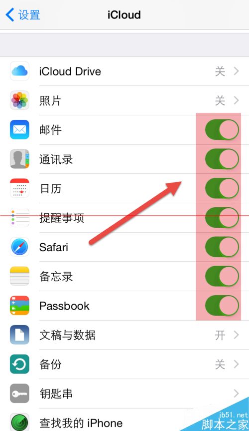 7、然后确认iPhone和iPad的iCloud下为同一个Apple ID,并且开启了你需要的功能,例如通讯录、提醒事项、邮件、日历等,如果需要使用Pages、Numbers、Keynote需要开启iCloud Drive