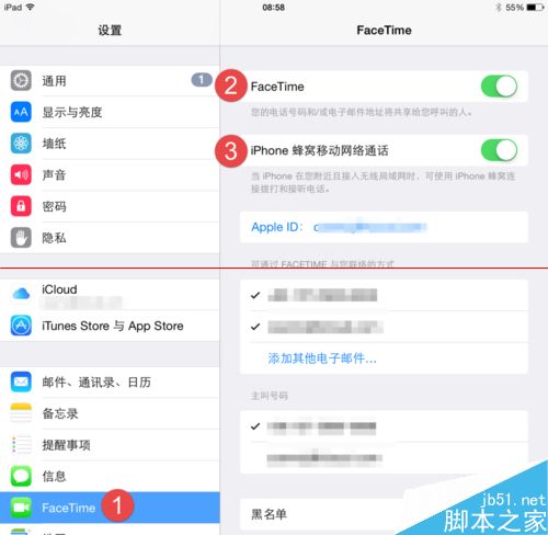 8、如果要让iPhone、iPad有电话时同时同时响铃,需要点击【设置】-【facetime】,确认facetime已经开启,并且【iphone蜂窝移动网络通话】也同样开启了