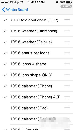 2.安装主题包【ios 6 complete for ios 7 8】(ios和6中间加空格,不然搜不到)没有下载过winterboard会一起捆绑下载,下载后勾选如下选项后注销