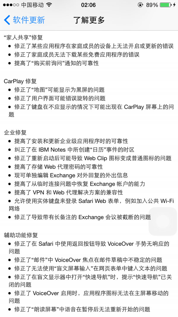 其他小改变包括空格按钮的UI,空格按钮已经被加长防止输入空格时误输入句号。最后,iOS 8.3 允许用户进行设置,可以在下载免费应用时免输入密码。iOS 8.3 还包含了大量的错误修复,包括 WiFi、蓝牙、信息方面的功能改进等。下面是详细更新说明。