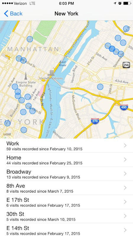 许多人不知道的是,其实你的iPhone一直在后台默默记录你的前往地点信息。我们可在设置——隐私——定位服务——系统服务中看到有一个“常去地点”的选项,这个菜单下方则会显示出数个用户常去的地点数据。