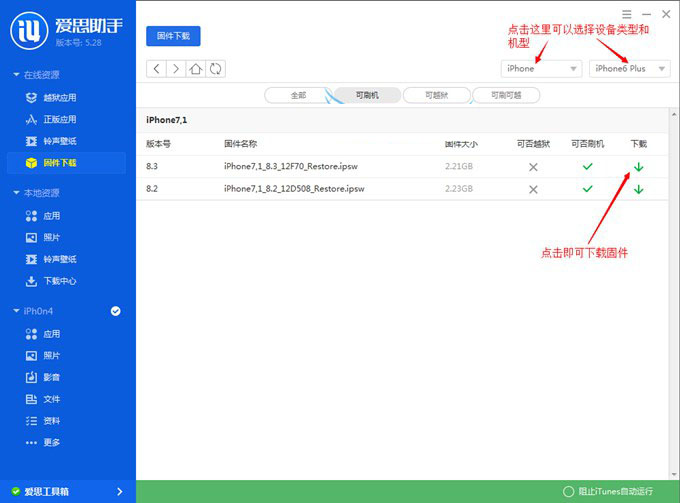 1.首先在电脑中下载安装新版的爱思助手,完成后,将iPhone6通过数据线与电脑连接,然后打开爱思助手,然后打开“在线资源”-“固件下载”区选择机型型号与需要刷机的iOS固件版本,这里以刷最新的iOS 8.3系统为例,如下图所示。