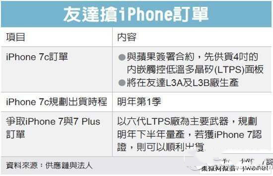 业界传出,友达与苹果签供货合约,由友达供应苹果iPhone 7c搭载的4英寸面板,明年首季出货,不仅是友达首度成为iphone面板供应商,也是台湾面板厂首次与日、韩同业分享iphone订单。