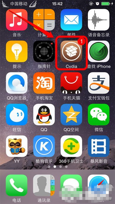 3、这里我们看到了手机桌面,其实是在伪安全模式下,像我自己修改的dock栏透明、3D翻页等都失去效果,点击进入cydia。