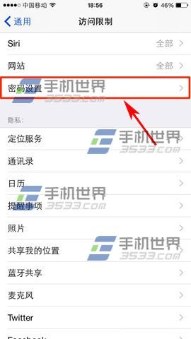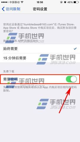 2)然后返回【设置】-【通用】-【访问限制】部分,找到【密码设置】,将免费下载项右侧的开关关闭即可(你可以再次启用 Touch ID 购买付费内容)。