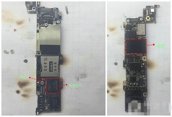 从左到右分别是硬盘也就是16G的存储器(存储手机序列号),第二个是基带芯片,第三个是码片,(基带芯片和码片是一套的基带配合码片里存储的IMEI才能正常工作)所以理论上来说更换这个三个芯片就好了,但是由于目前5s码片数据读写已经被大神们攻破了,所以换的时候换基带和硬盘就好了,码片数据用专业编程器写进去就好了。然后们看看这三个芯片在主板上的位置