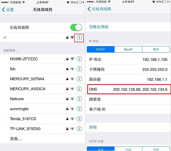 2、在无线局域网设置中,点击已经连接Wifi网络名称后面的【i】标识,之后就可以看到DNS设置了,如下图所示。