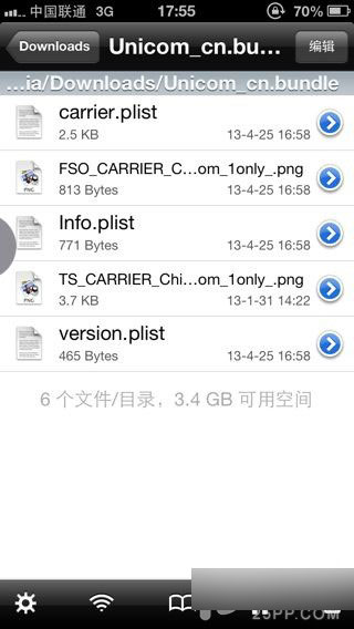 4、用UC浏览器下载附件解压后,有一个Unicom_cn.bundle文件夹,进入后有6个文件依次点右边的下三角选项键选打开方式,用ifile软件依次打开,在用ifile复制一起拷到System/Library/Carrier Bundles/iPhone/Unicom_cn.bundle目录下,覆盖原来的文件就可以了。最下面的附件我已覆盖好了,直接全部覆盖原机的就可以了,以修改好运营商版本为18.1。是6个文件,原机是5个文件。按教程一步步来很简单。手机端操作就行了。用UC浏览器下载附件,解压后用ifile打开复制粘贴就行了。