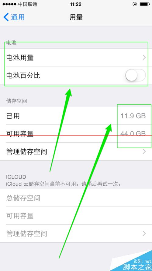 第四步,进入“用量”后,如箭头所示就可以设置“电池百分比”和查看手机内存以及当前内存了。