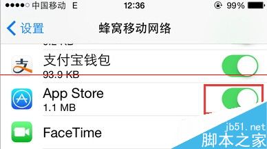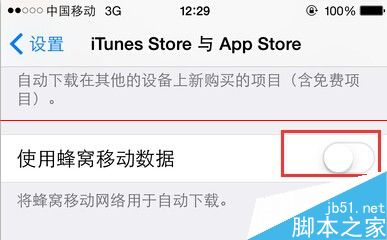 进入到iTunes Store与App Store页面,查看一下使用蜂窝移动数据选项是否之前被关闭了,点击打开右侧的开关按钮,然后重新打开一下App Store,看是否已经恢复正常