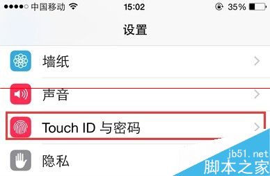 2、在打开的iPhone设置页面中,往下翻页,找到Touch ID与密码,点击打开