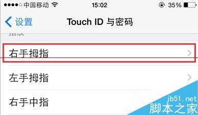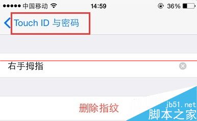 3、进入Touch ID与密码的设置页面,我们知道,当我们要添加指纹的时候,只需要点击下方的添加指纹按钮,通过手指的验证成功就可以,每添加完一个指纹,系统默认手指1、手指2的顺序进行排列,那么为了辨别手指N代表的实际哪个手指指纹,我们只能先由最常用的拇指开始,将右手拇指按到HOME键,这时所对应的手指指纹就会显示灰色,如下图所示的手指1,表明这就是右手拇指所对应的指纹,松开拇指,我们点击打开手指1