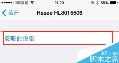 10、这时,页面下方将会弹出一个菜单栏,可以选择取消或者直接忽略该设备,我们点击忽略该设备,这样就可以删除掉之前连接过的设备信息,然后再次关闭iPhone蓝牙功能,再次打开进行蓝牙设备的搜索,看是否已经恢复正常;如果依然还不能够解决问题的话,那么只能考虑一下升级iOS系统到最新版本了