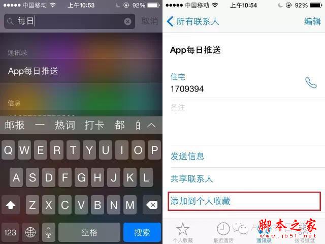 在桌面主屏的状态下,手指往下一划,就可以直接搜索联系人的名字,就能准确定位并打开联系人。点击即可打开联系人详细页面来拨打电话了。如果是经常拨打的电话,还可以添加到个人收藏呢。