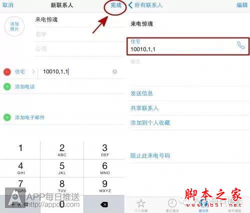 点一下“暂停”,电话号码后面就会出现一个逗号,在逗号后继续输入查询话费要按的数字,联通用户需要按两次1,所以号码就存为10010,1,1,然后点“完成”。下次要查话费的时候,只要在通讯录里直接拨打就可以了!