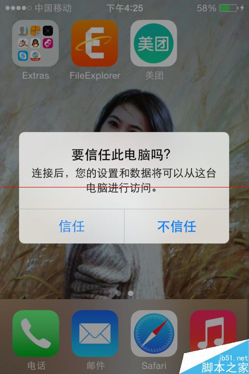 3、解锁手机屏幕,就可以看到询问是否信任的窗口了,点击信任,就可以把手机上的图片之类的同步到电脑了