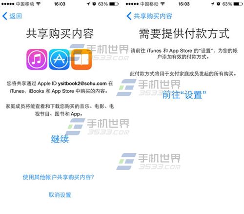 2)点击【继续】,如提示【需要提供付款方式】的话,请【前往设置】绑定一张银行卡。PS:在中国App Store还不能绑定信用卡,所以购买共享还不能用。(如下图)