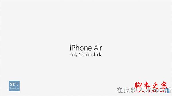 SET Solution 上载的 YouTube 影片之中,他们看来懂得由6.1 mm的iPad Air 取经,以一枝笔的概念广告表示这 iPhone 之薄,只有 4.3mm 薄的 iPhone Air。虽然是超薄,但是看外壳基本上与 iPhone 6 没有太大的变化,都是黑色壳配上下两条碍眼的白线,但屏幕只有 4 吋,令机身不止更薄,还要更小,而且作为概念设计,突出的镜头被铲平,从上至下贯彻这部超薄 iPhone Air。同时除了 64GB 容量之外,iPhone Air 也复活了 32GB 容量选择。