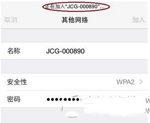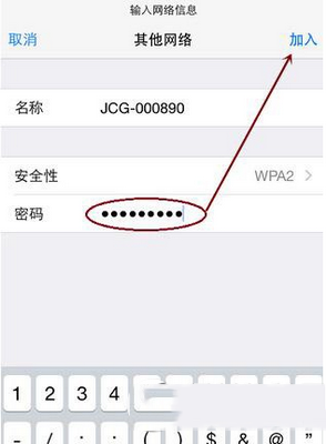 6.接下来输入正确的WiFi无线网络密码,单击“加入”,iPhone就开始尝试连接隐藏的WiFi信号了。