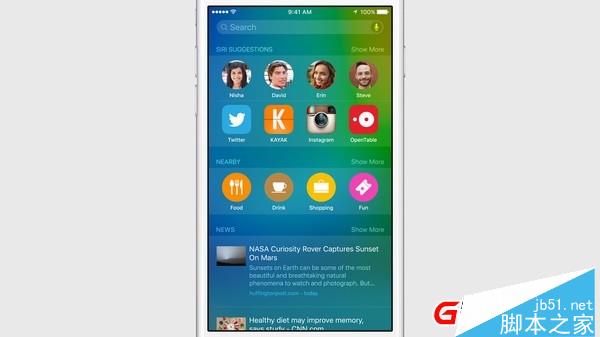 在iOS 9中首先被提到的是更加智能的Siri,其速度和准确度都提升了40%,你现在将可以向 Siri 查询更多主题的内容。例如,让它帮你查找某个照片或视频,又或者让它提醒你别忘了刚才在 Safari 里浏览的内容。