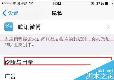 3、在打开的iPhone隐私设置页面当中,往下翻页,在页面的最底部可以看到诊断与用量栏目,点击打开它进入到下一步操作页面