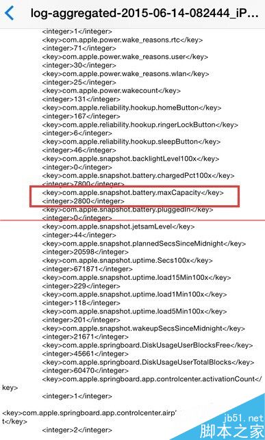 7、在打开的页面中,你将会看到密密麻麻的满屏数据,不要被这些数据吓坏了,我们要找的只是里面的一个数据而已,将页面翻到最底部,然后再慢慢往上翻,找到一个“<key>com.apple.snapshot.battery.maxCapacity</key><integer>2800</integer>”的数据