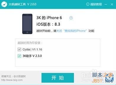 5、当下载完成以后,会自动运行太极越狱助手,如图所示。此时如果你的 iPhone、iPad 或 iPod Touch 打开了 iCloud 中的“查找我的iPhone”选项,请先关闭它。准备好以后,请点击“开始”按钮,开始越狱之旅。