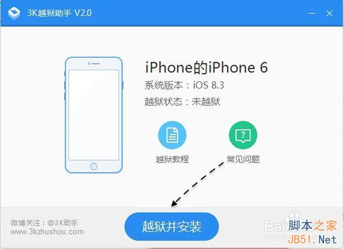 3、当 3K 助手检测到接入的设备以后,会出现“越狱并安装”按钮,请点击它继续。