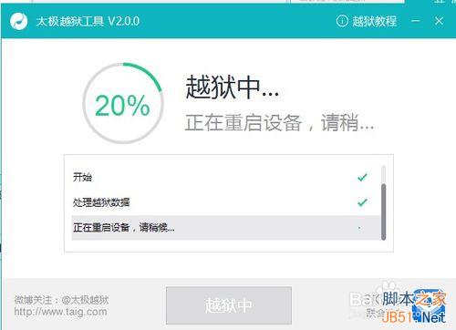 6、如下图所示,在越狱到20%的时候,此时设备会被强制重启,屏幕上会出现白苹果标志,不用理会,继续等待越狱工具进行越狱。