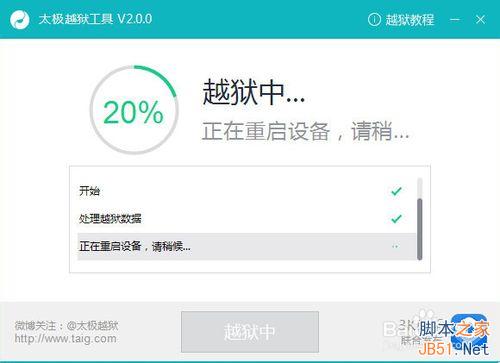 1、如下图所示,当使用太极越狱工具时,会遇到一直卡在20%的阶段,并且最后出现越狱失败的结果。