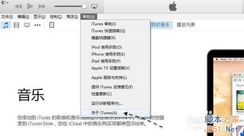 2、当前 iTunes 最新的版本为 12.1.X,问题就出在它身上。先请打开 iTunes 软件,在菜单栏中的“帮助”中查看“关于 iTunes”,看看当前的版本是多少。