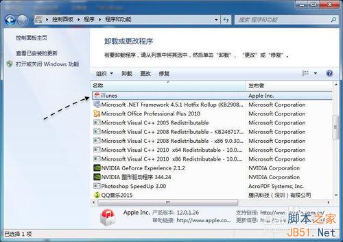 4、接下来请在系统中打开控制面板,在卸载程序窗口列表中,找到 iTunes 一栏,先把它卸载了。当卸载完成以后,重新启动一次电脑系统。