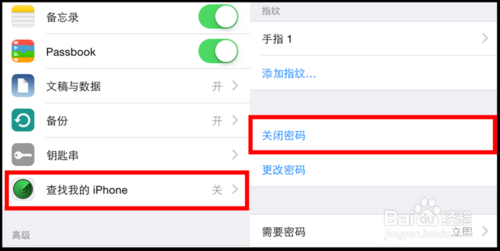 5、安装好后,我们开始做手机越狱前的准备,1、把手机的的密码关闭了(设置——Touch ID与密码——关闭密码“,2、把”查找我的 iPhone“关闭了(设置——icloud——查找我的 iPhone——关闭”。