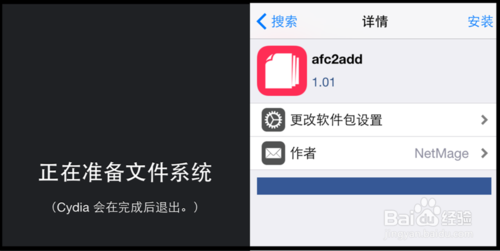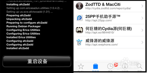 9、越狱成功后,我们打开手机的Cydia,这时候它会进入一个准备工作,这个步骤完毕它会重启手机,重启手机后我们再次打开Cydia,我们下载安装“afc2add”插件,安装后,点击重启设备,进入Cydia添加一些常用源,就可以下载安装自己喜欢的插件了!